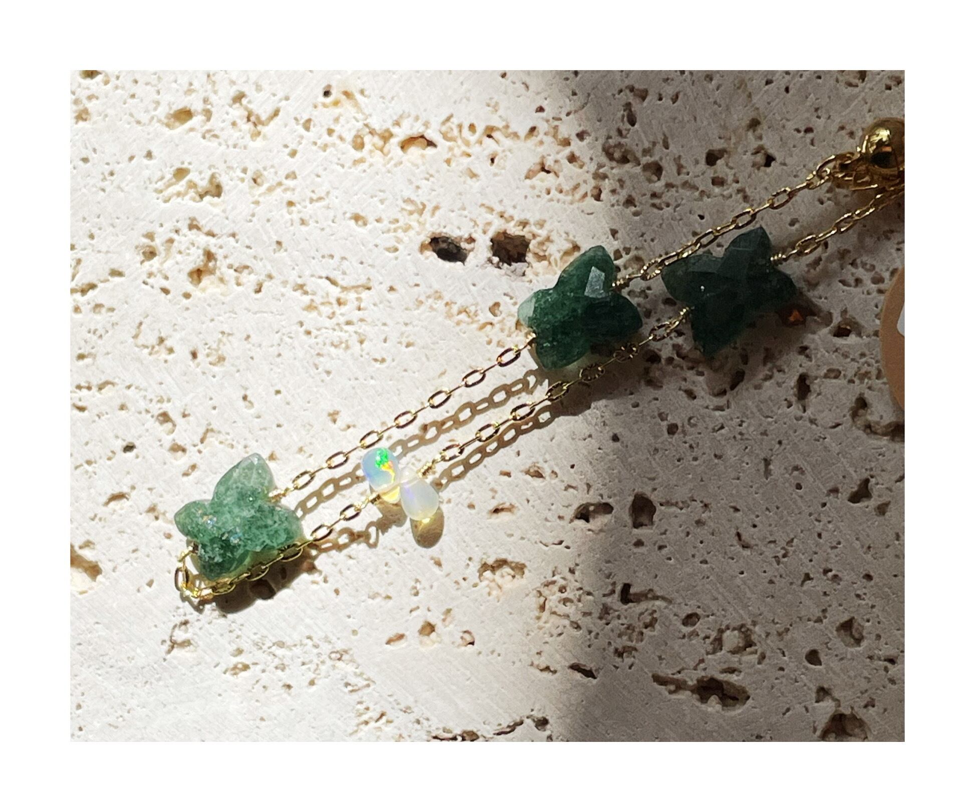グリーンストロベリーバタフライの深みのある緑は、内包物がキラキラと光を届けてくれるので、派手すぎない華やかさが溢れます。