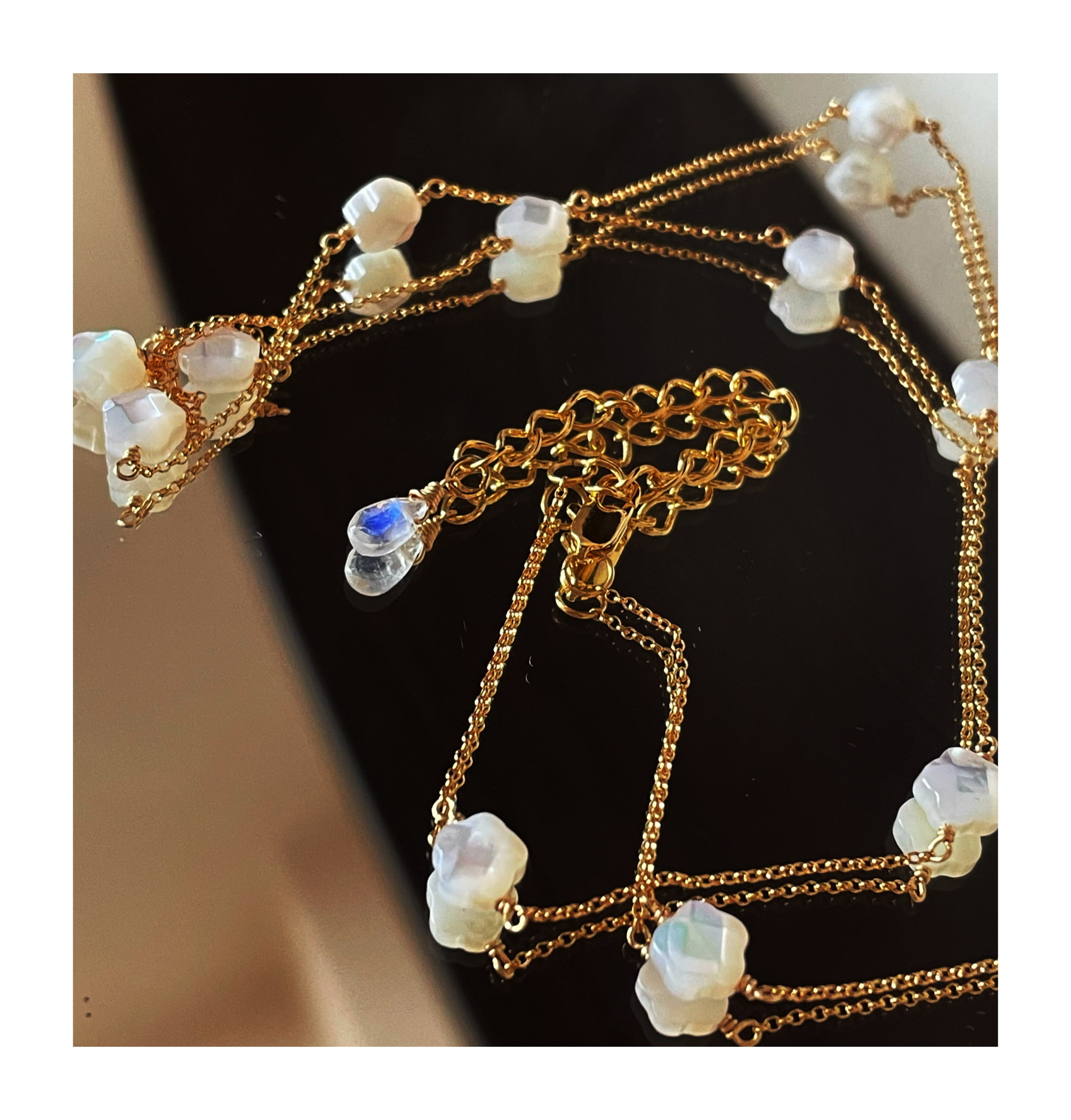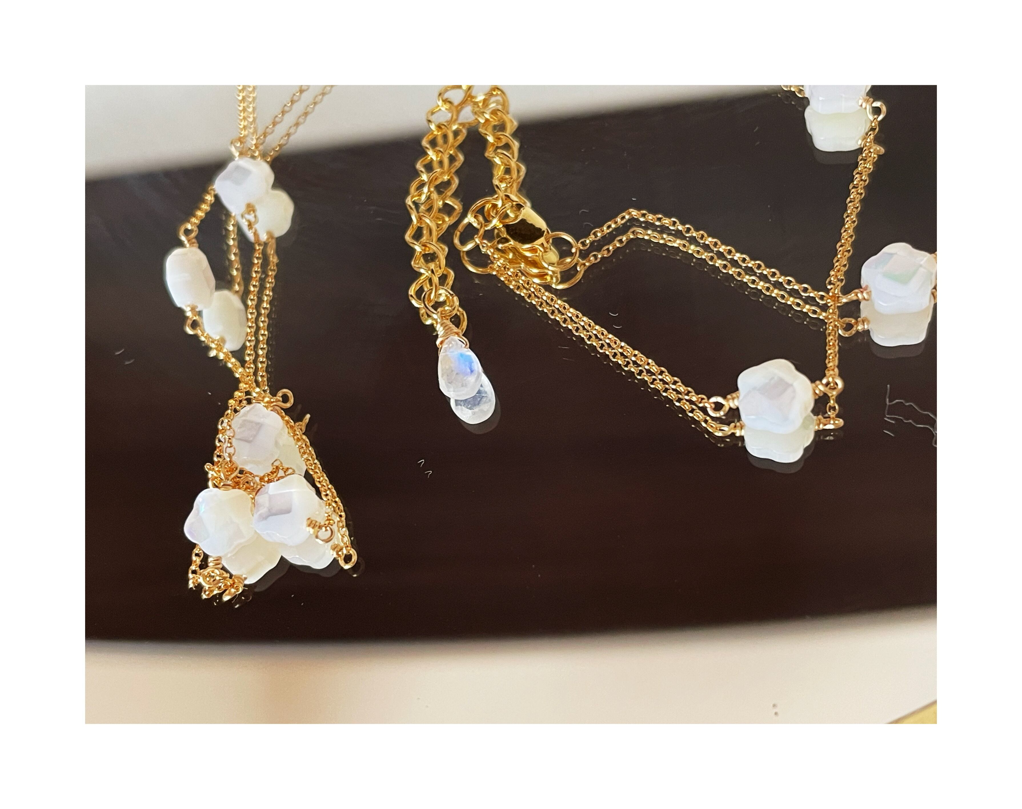 小さな花型のシェルが美しいロングネックレスです。アジャスターにはブルームーンストーンをあしらいました。ブルーシラーがとても綺麗です。