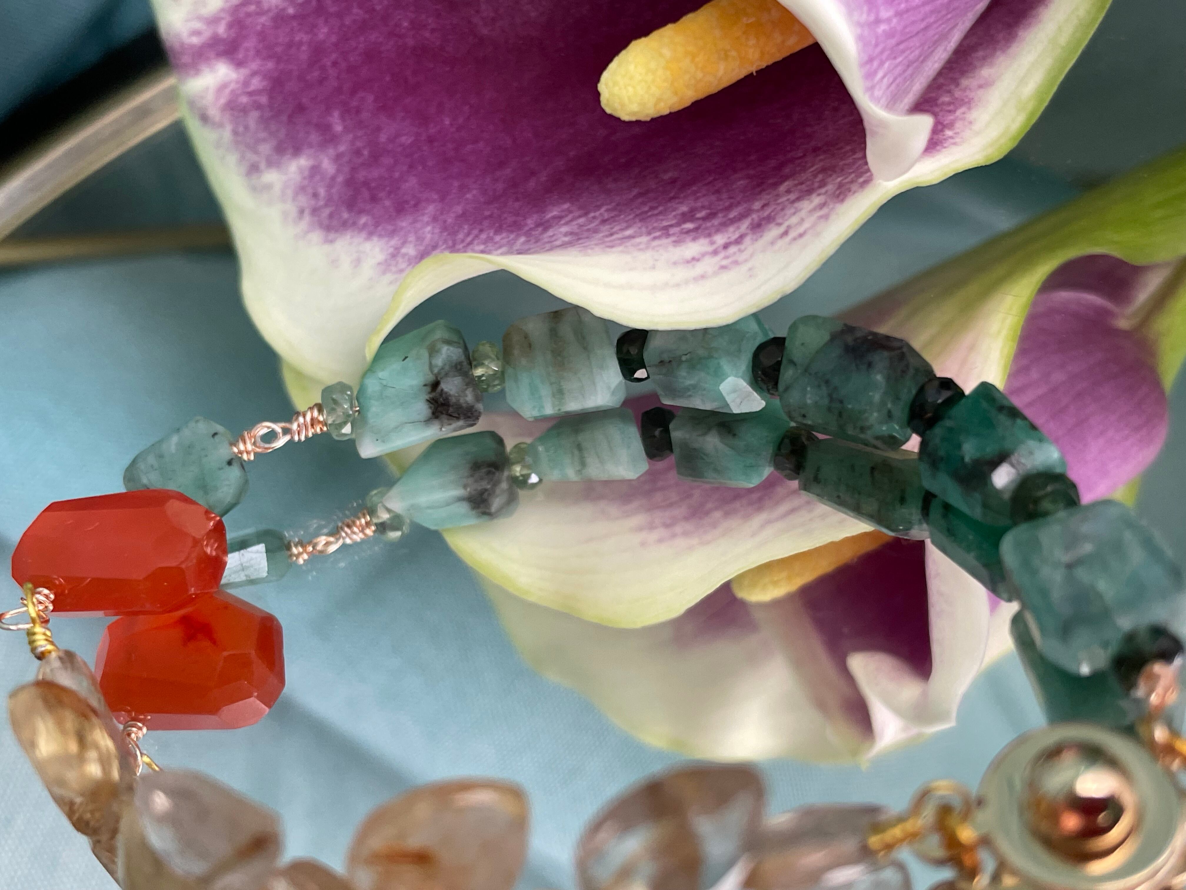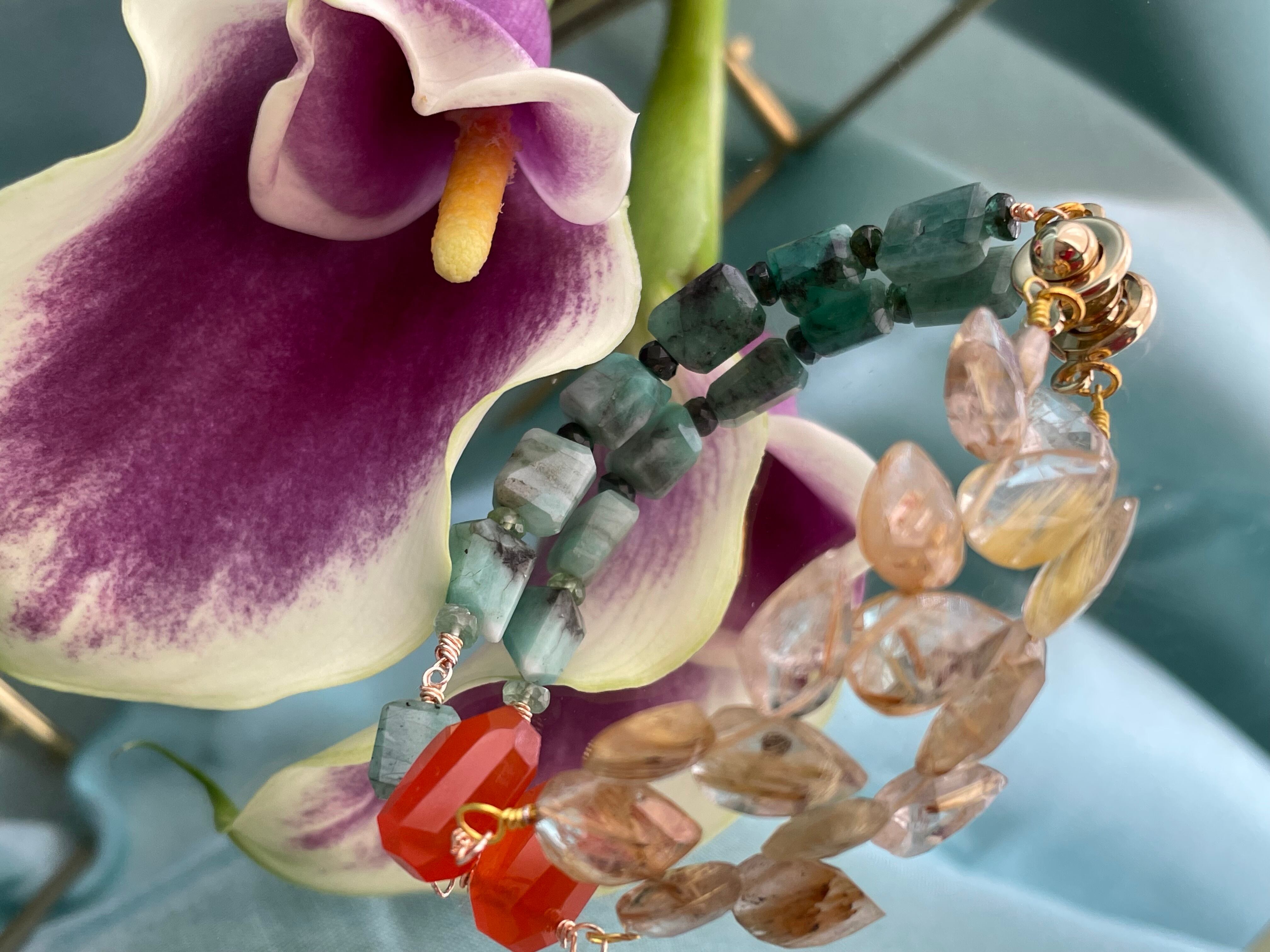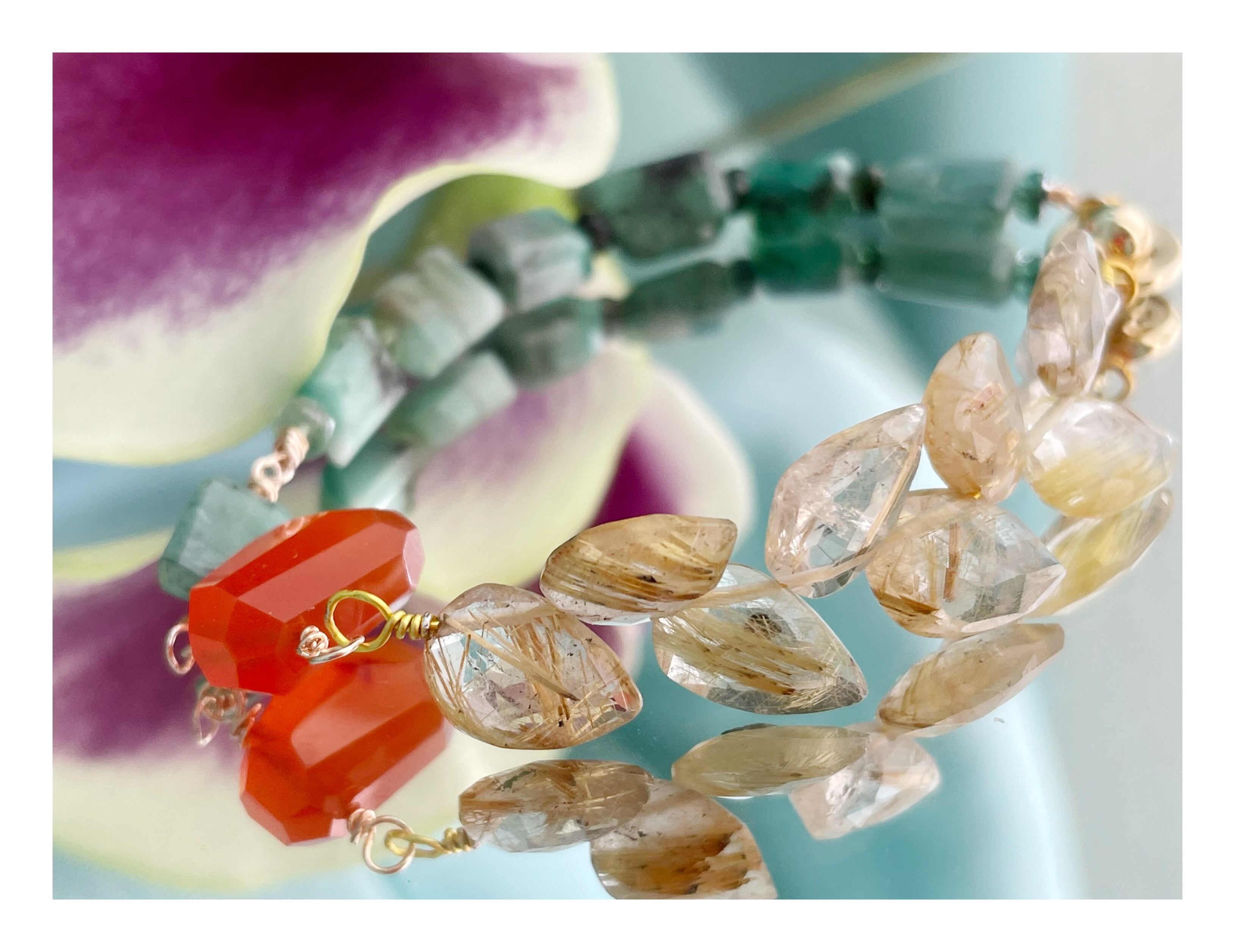 -ルチルクォーツ、エメラルド、グリーントルマリン、カーネリアン
