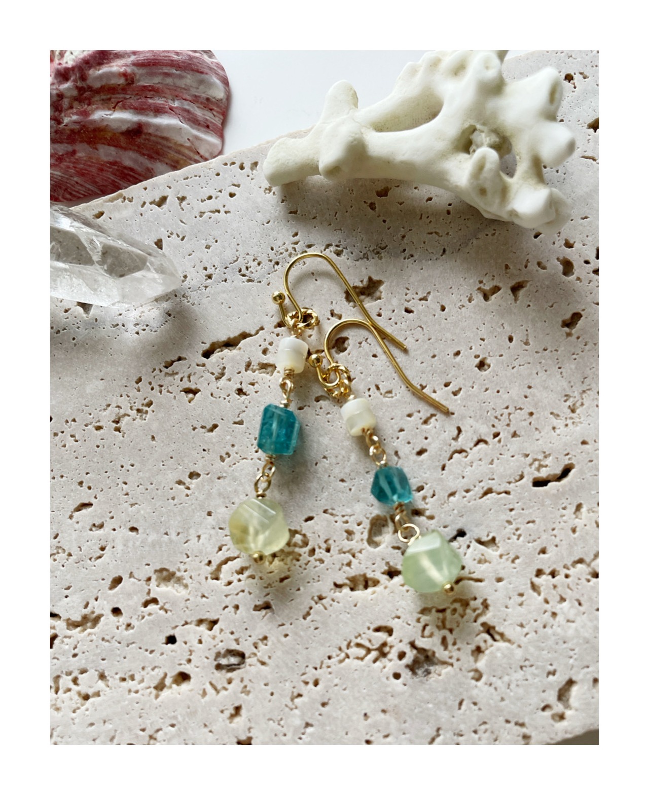優しいシェルの輝きと、すこんと突き抜けたブルー、そしてふんわりきらりんカットのイエローからグリーンのクォーツたち。