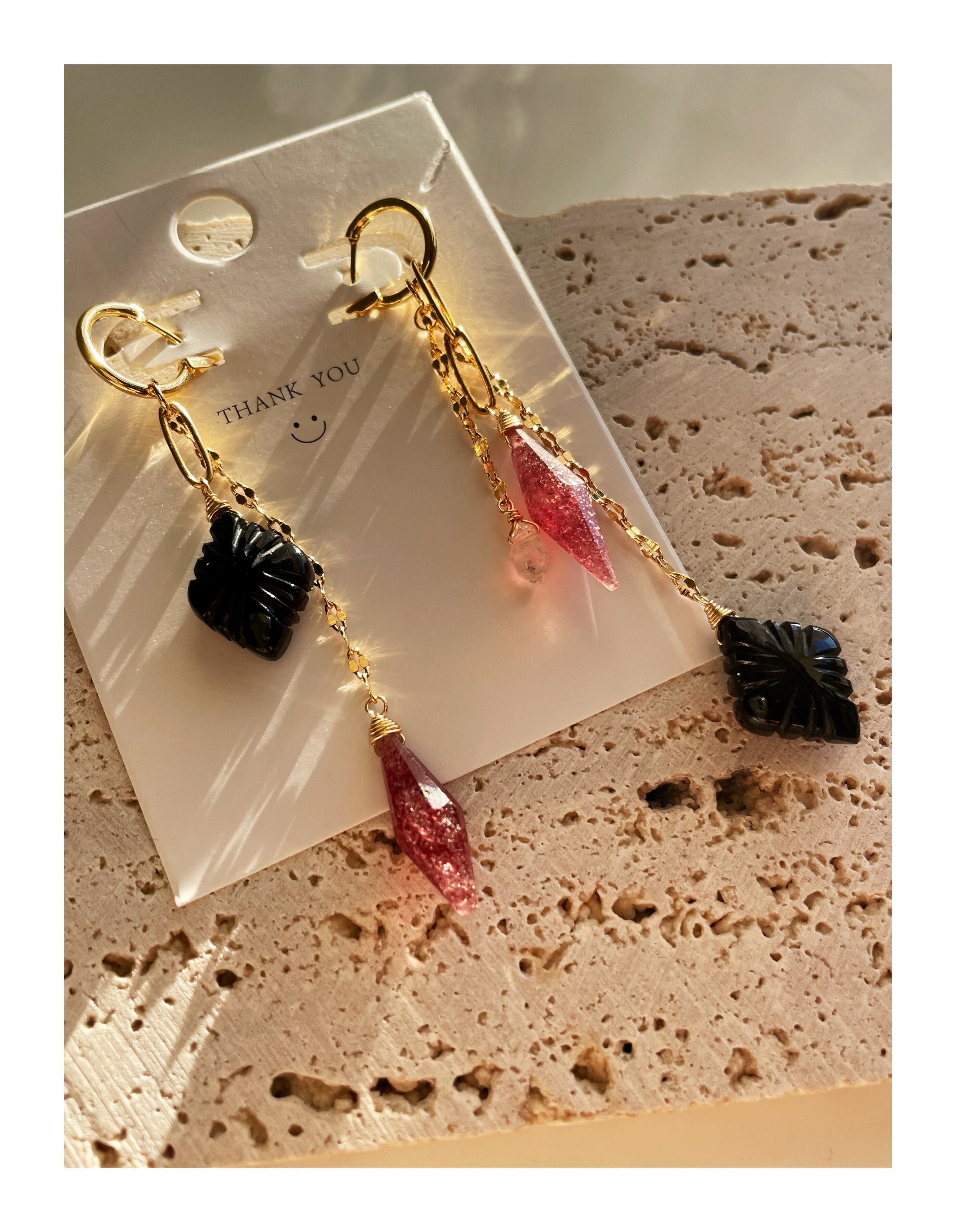 両面にカービングが施された美しいオニキスの迫力は、添えられたピンクと煌めきの一粒ダイヤモンドクリスタルで優しく、軽やかに変わります。